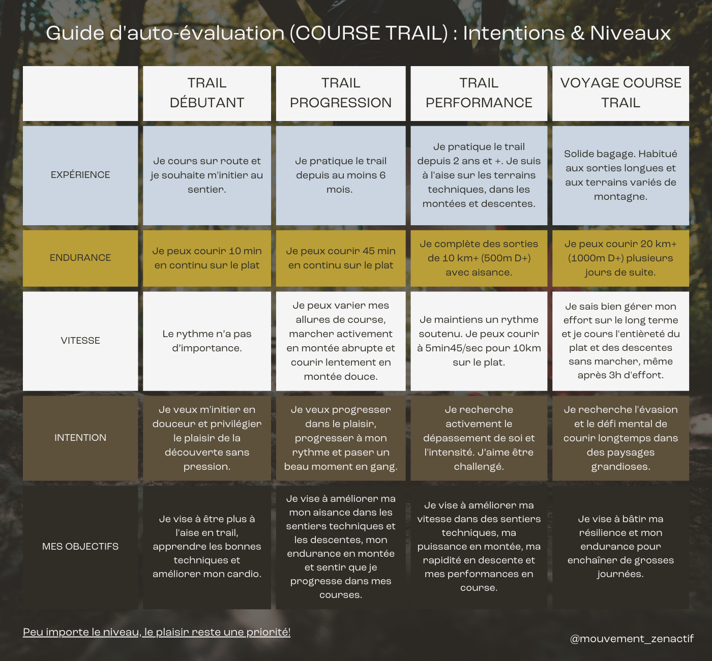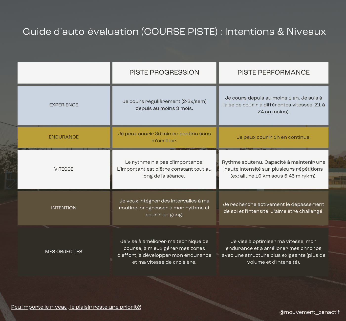 Nos cours sont conçus pour que chacun puisse progresser à son propre rythme. Puisqu’un groupe 100 % homogène n’existe pas, notre objectif est de rassembler des coureurs partageant les mêmes intentions et objectifs afin de créer la meilleure dynamique possible.